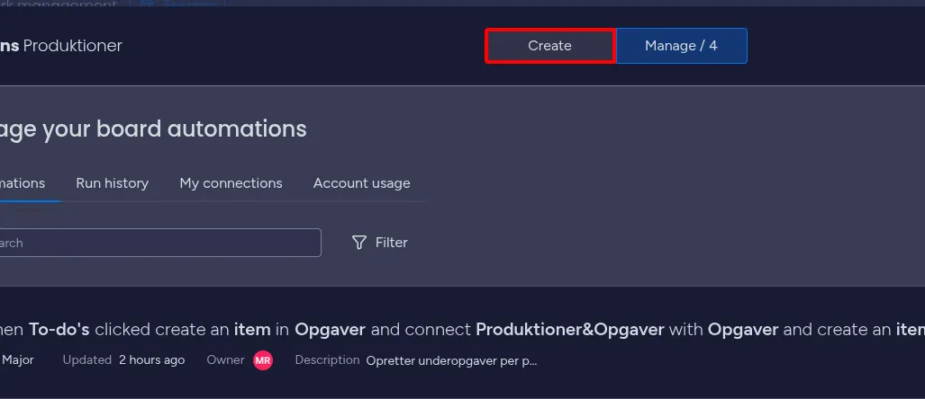 Sektion kaldt “Opret en automatisering”Du kan her vælge at søge i Monday.com’s allerede oprettede templates, der dækker rigtig mange opgaver, eller du kan oprette din helt egen, hvis ikke du finder det du ledte efter.