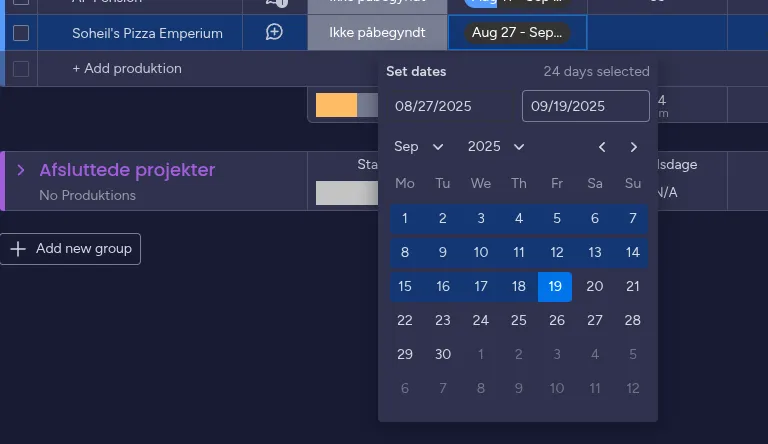 Efter at have valgt produktionens start- og slutdato, vil kolonnen Arbejdsdage automatisk fortælle hvor mange arbejdsdage der på denne produktion (man-fre).