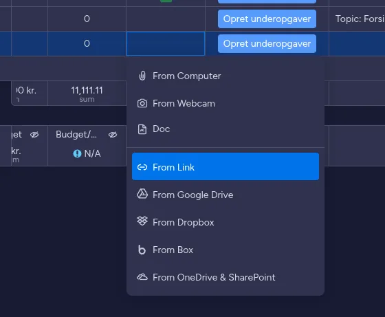 Klikker man på cellen vil man få mulighed for at uploade fra sin Computer, Dropbox, Google Drev, Box eller Microsoft Onedrive, ligesom man også kan indtaste et link eller referere til et “Monday-Dokument” eller endda direkte tage et billede med sit webcam, hvis man ønsker en sjov måde at sende sine kollegaer en selfie eller lign.