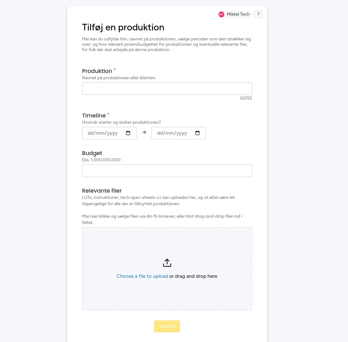 - Udfylde felterne: Produktion, Timeline (til og fra dato), Budget og eventuelt hvis der er nogle relevante filer på dette tidspunkt.